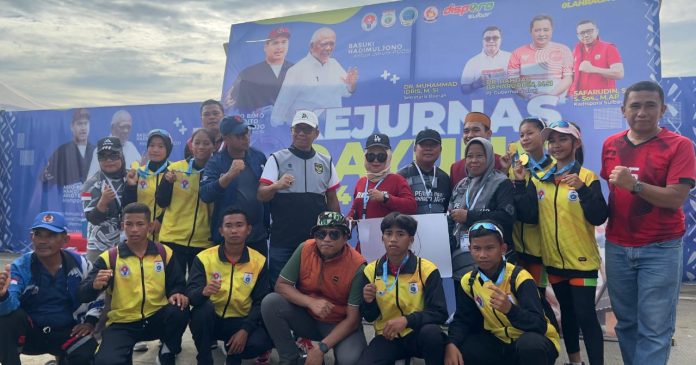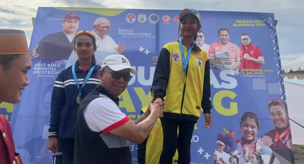Kepala Dinas Kepemudaan dan Olahraga (Dispora) Sulawesi Barat, Safaruddin Sanusi DM yang menyerahkan langsung dua medali emas kepada atlet Dayung Sulbar ini.