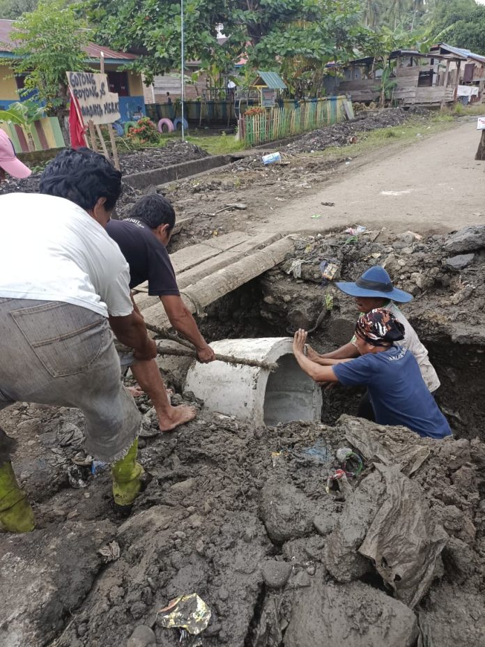 Dari Panataun Media ini sejumlah warga Desa Ahu Bersama Perangkat Desa Melakukan Kerja bakti atau gotong royong Untuk melakukan perbaikan gorong-gorong jalan poros yang sudah rusak parah.