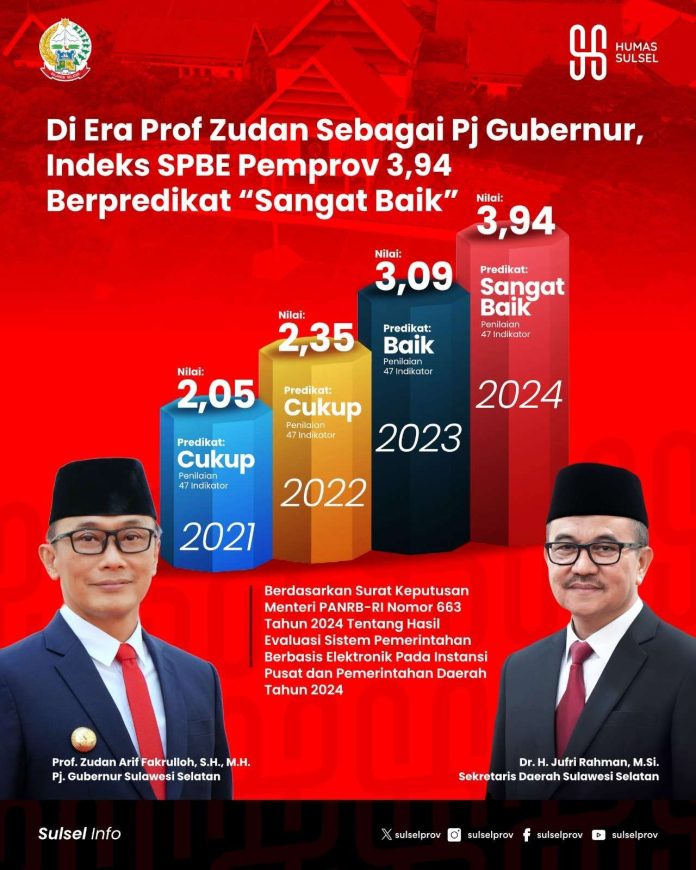 Makassar, MandarPos – Penilaian Indeks SPBE (Sistem Pemerintahan Berbasis Elektronik) Instansi Pusat dan Pemerintah Daerah (IPPD) Pemprov Sulsel untuk tahun 2024 memiliki nilai 3,94 dengan penilaian 47 indikator. Penilaian ini dilakukan oleh Kementerian Pendayagunaan Aparatur Negara Reformasi Birokrasi (Kemempan RB).