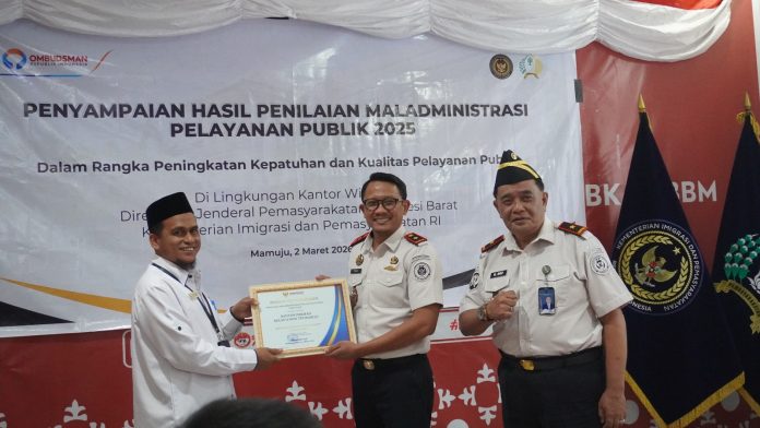 Mamuju-Mandarpos.Com– Kepala Perwakilan Ombudsman Republik Indonesia Provinsi Sulawesi Barat, Fajar Sidiq, secara resmi menyerahkan Hasil Penilaian Maladministrasi Penyelenggaraan Pelayanan Publik (Opini Ombudsman) Tahun 2025 kepada jajaran Kantor Wilayah Direktorat Jenderal Pemasyarakatan dan Direktorat Jenderal Imigrasi pada Kementerian Imigrasi dan Pemasyarakatan Republik Indonesia. Kegiatan ini dilaksanakan di Aula Lembaga Pemasyarakatan Perempuan Kelas III Mamuju, pada 2 Maret 2026.