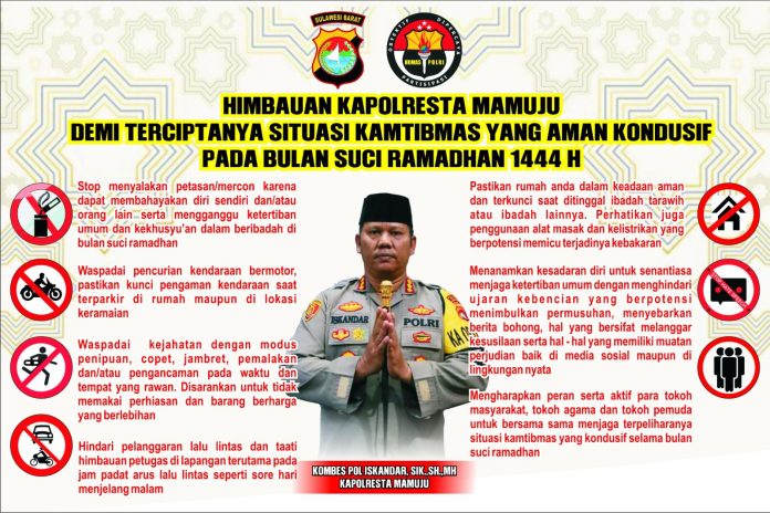 “Marhaban Yaa Ramadhan” Kapolresta Mamuju Kombes pol Iskandar Berserta Jajaran Mengucapkan Selamat Menunaikan Ibadah Puasa Ramadhan 1444H/2023 M. Mari Ciptakan Suasana Ramadhan di mamuju Tenang dan Damai Tanpa Petasan, Balapan Liar Sucikan Diri Bersihkan Jiwa Menuju Ridha Ilahi, Semoga Kita Hijrah Kepada Yang Lebih Baik. Ungkap kasi Humas Polresta Mamuju Ipda Herman . **