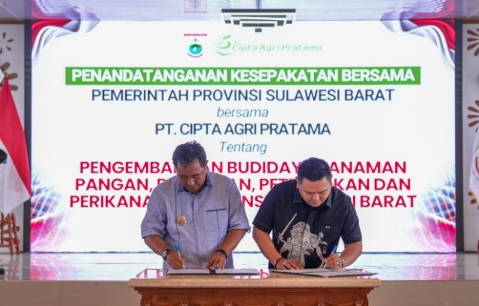 Bertempat di di gedung graha sandeq Pemprov Sulbar, Sabtu, 8 Juni 2024. Pemerintah Provinsi (Pemprov) Sulbar dan PT Cipta Agri Pratama (CAP) melakukan penandatanganan kesepakatan bersama pengembangan budidaya tanaman pangan, pertanian, peternakan dan perikanan.