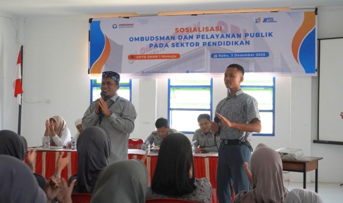 Mamuju, MandarPos.com – Ombudsman Republik Indonesia Perwakilan Sulawesi Barat Melakukan Sosialisasi dalam meningkatkan kualitas Pelayanan Publik di sektor Pendidikan yang di gelar di Aula lantai 2 Unit Pelaksanaan Teknis Daerah (UPTD) Sekolah Menengah Atas Negeri 1 Mamuju (03/12/2025).